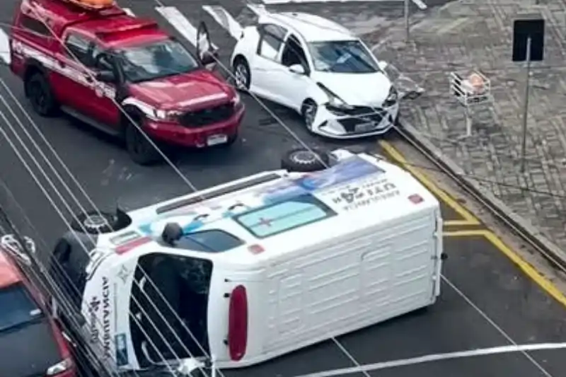 Acidente em cruzamento no centro termina com ambulância capotada e criança ferida