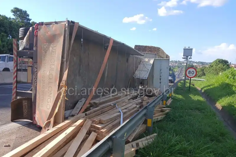 Carreta carregada com madeira tomba na rodovia do Contorno em Marília e causa lentidão no tráfego