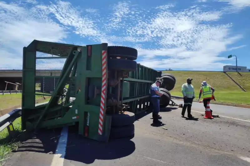 Carreta tomba e interdita trecho da Rodovia João Batista Cabral Rennó em Bauru