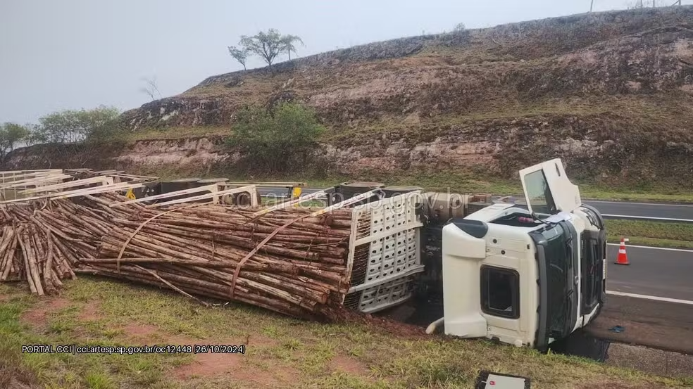 Carreta com carga de madeira tomba em rodovia no interior de SP