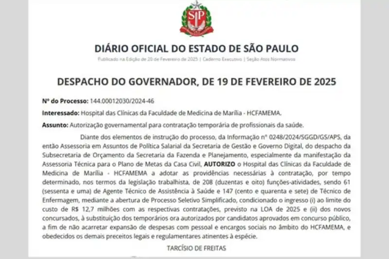 O Governador de São Paulo, Tarcísio de Freitas, autorizou no dia 20 de fevereiro de 2025 a contratação de 208 novos profissionais para o Hospital das Clínicas da Faculdade de Medicina de Marília (HCFAMEMA). A medida inclui 61 vagas para Agente Técnico de Assistência à Saúde e 147 vagas para Técnico de Enfermagem, que serão […]